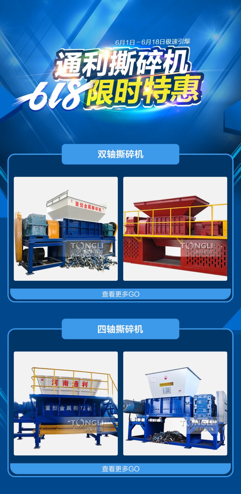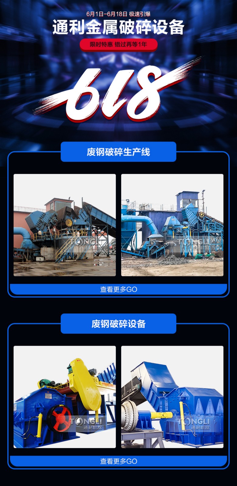 一年一度的6.18馬上要來臨了,各個(gè)廠家,網(wǎng)購app,實(shí)體店等等都紛紛為了這次活動卯足了勁兒,這不,趁著此次活動,河南通利廠家也來搞個(gè)促銷,廠區(qū)現(xiàn)有的中小型金屬破碎機(jī),單機(jī),整套購買均有不同折扣的惠活動,款款現(xiàn)貨等您來。